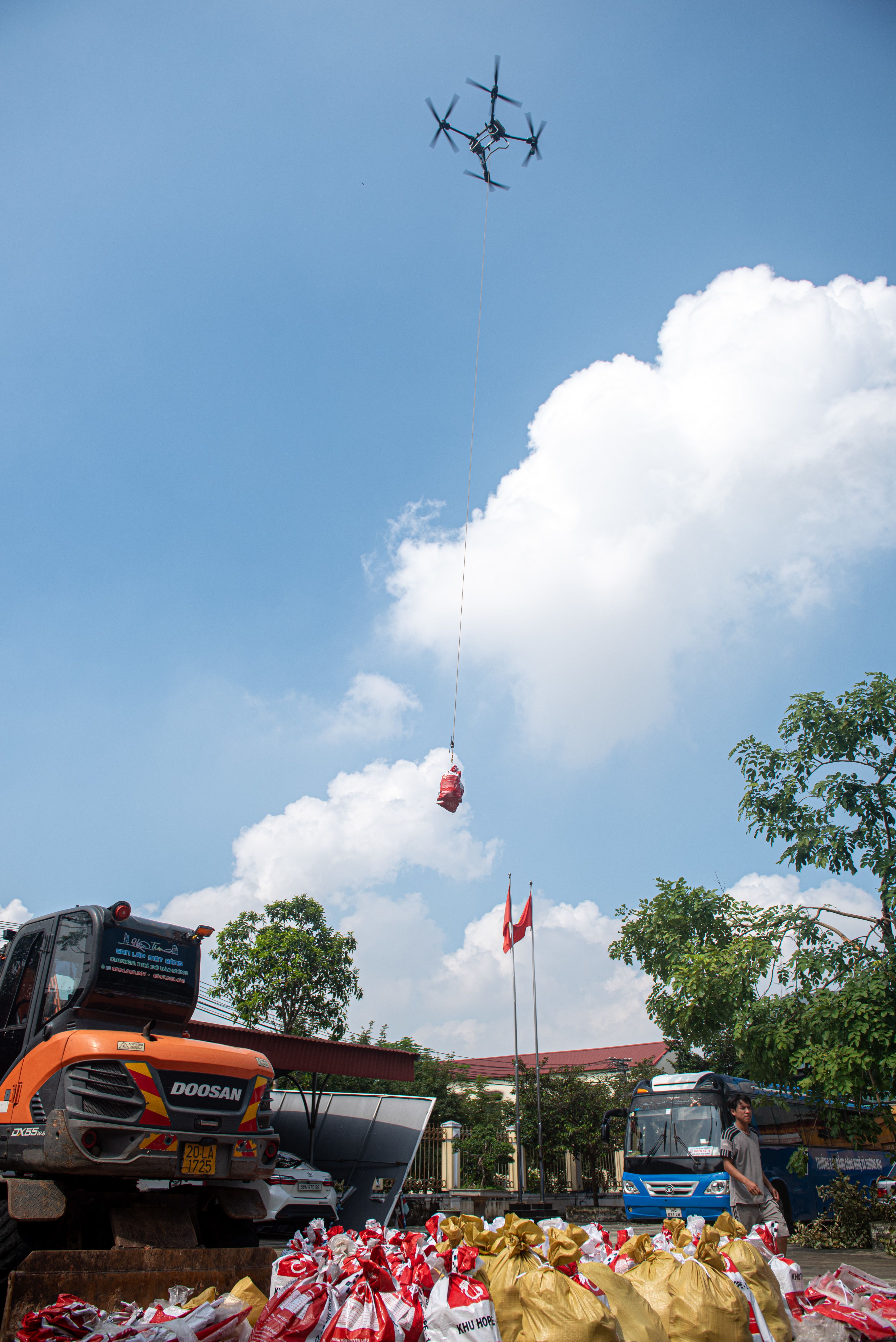 Quang Vịnh said: “Even though the group came together spontaneously, we still organised everything according to a clear process. Before launching the large drones, we used flycams to map the terrain of the target areas, especially those unreachable by boats or canoes, or where the water currents were too strong. Then the larger agricultural drones would carry food and essential goods to those exact coordinates.