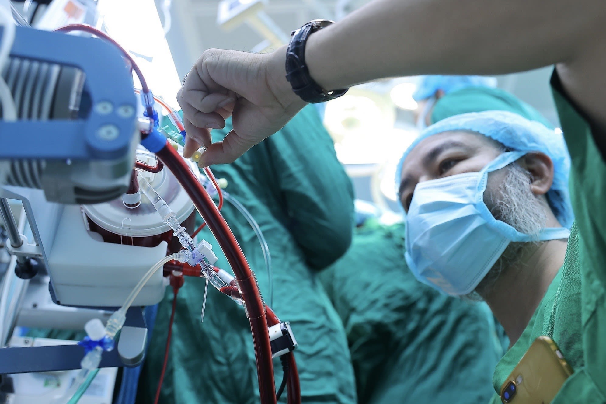 The medical team installs ECMO, an extracorporeal membrane oxygenation system that temporarily supports heart and lung function by circulating blood outside the body, oxygenating it and removing carbon dioxide before returning it to the patient.