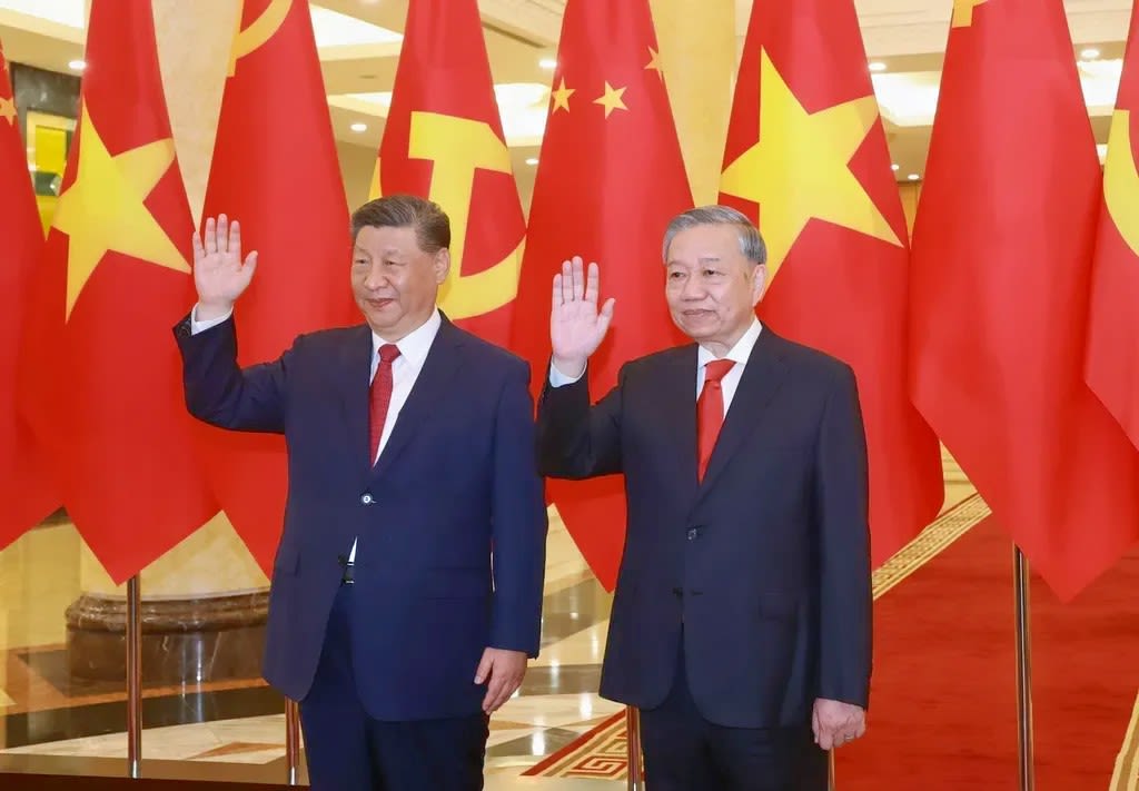 Party General Secretary Tô Lâm and General Secretary of the Communist Party of China Central Committee and President of China Xi Jinping at the welcoming ceremony in Hà Nội on April 14, 2025. VNA/VNS Photo Thống Nhất
