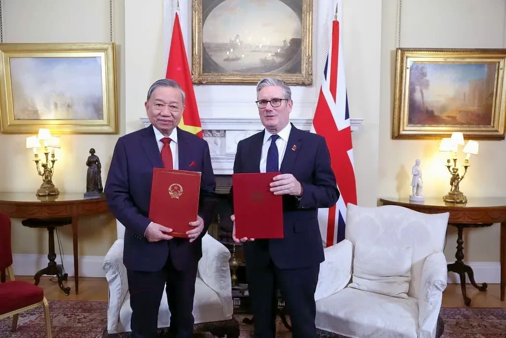 General Secretary of the Communist Party of Việt Nam Central Committee Tô Lâm and UK Prime Minister Keir Starmer exchange the joint statement announcing the elevation of Việt Nam–UK relations to a Comprehensive Strategic Partnership.