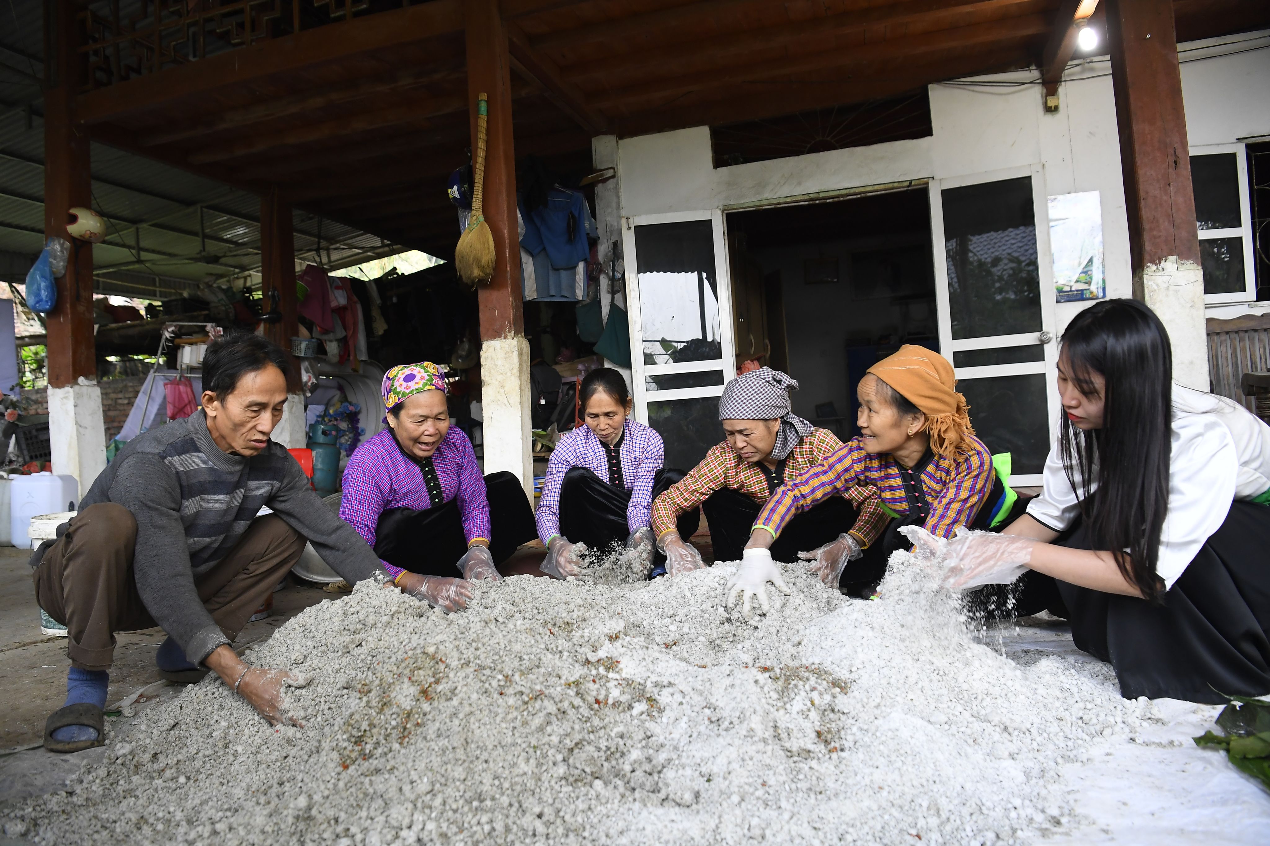 Lại Thanh Phương (first right) works with other members of her co-operative to make fermented rice from leaves, an important ingredient for making rice wine.