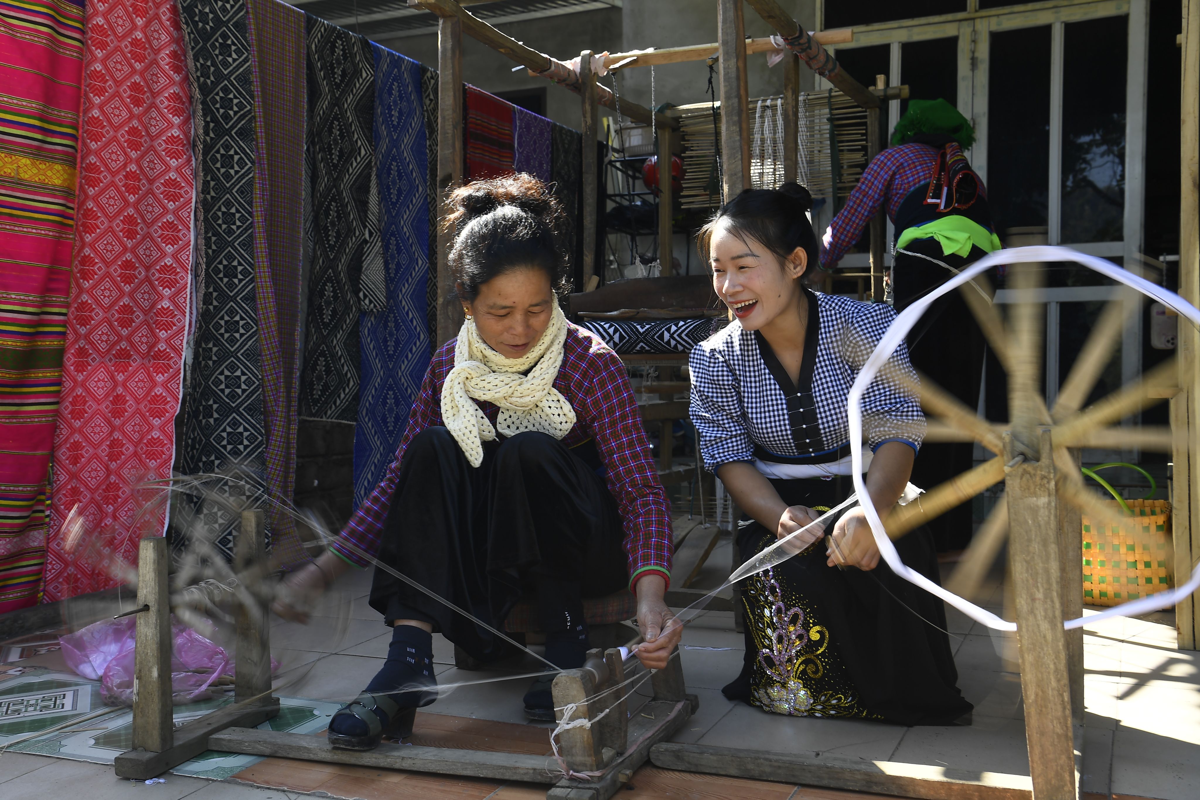 Hà Thị Thảo (right) works by a loom with a local woman.