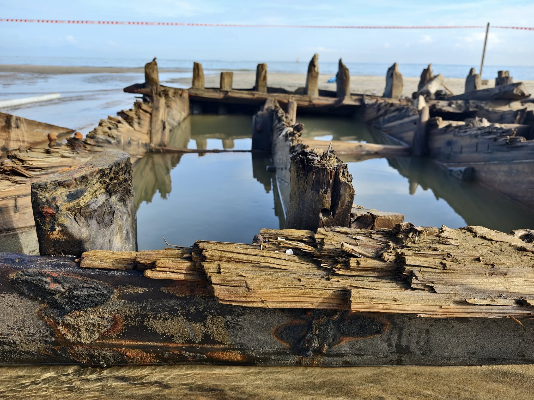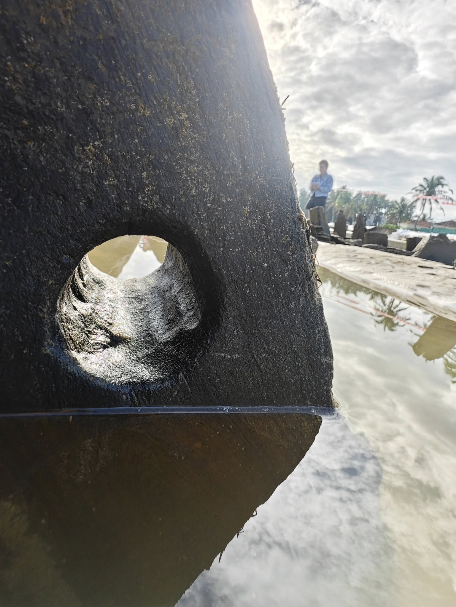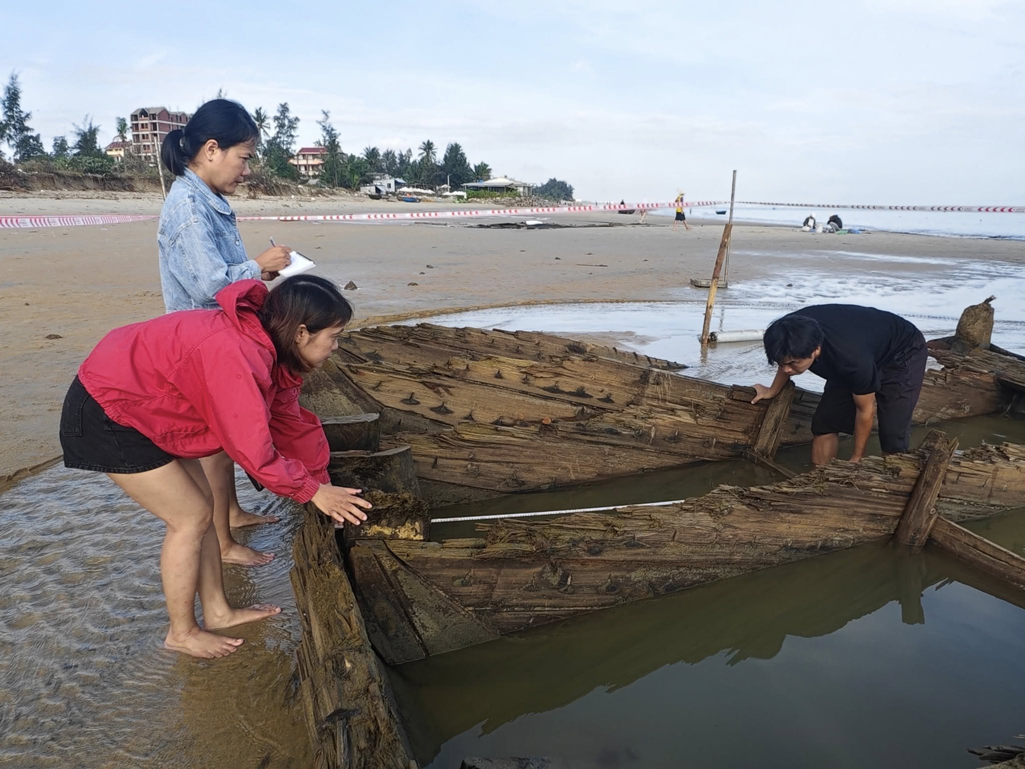 The hull first began surfacing in late December 2023 along the Cẩm An Ward coast (former Hội An City, Quảng Nam), about 400 metres from the ward People’s Committee office, when experts suggested the find could be an “ancient ship treasure” due to its then near-intact condition.