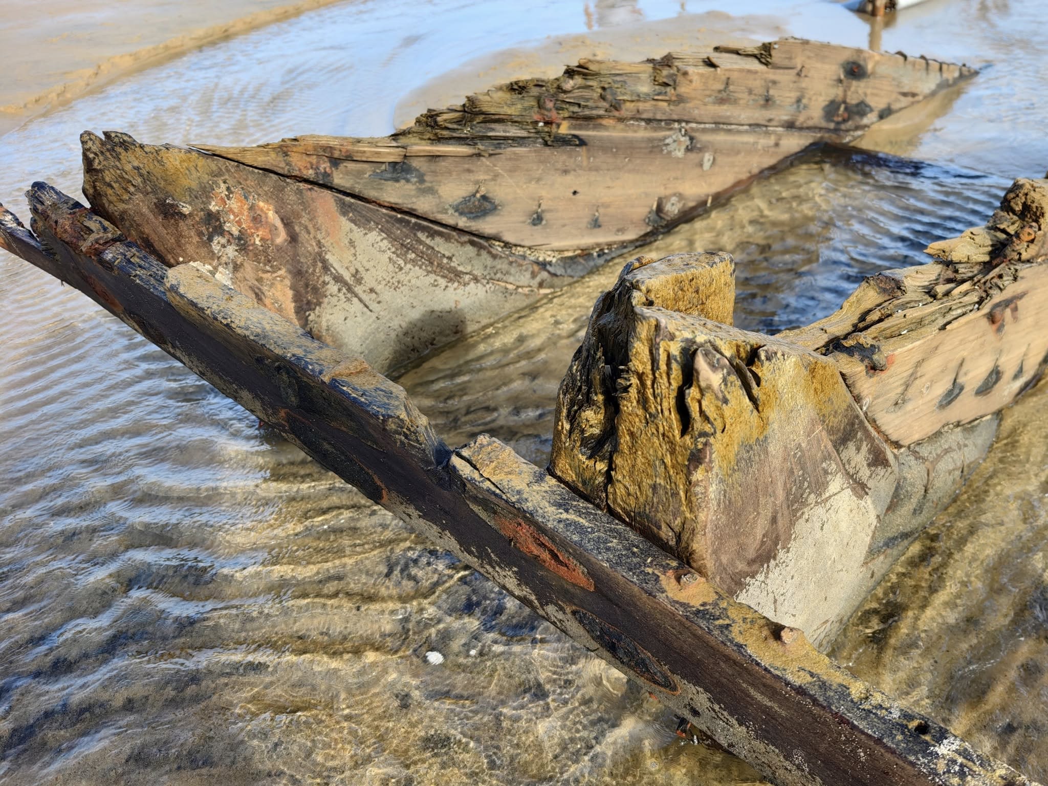 Tidal changes continue to alternately bury and reveal sections of the vessel.