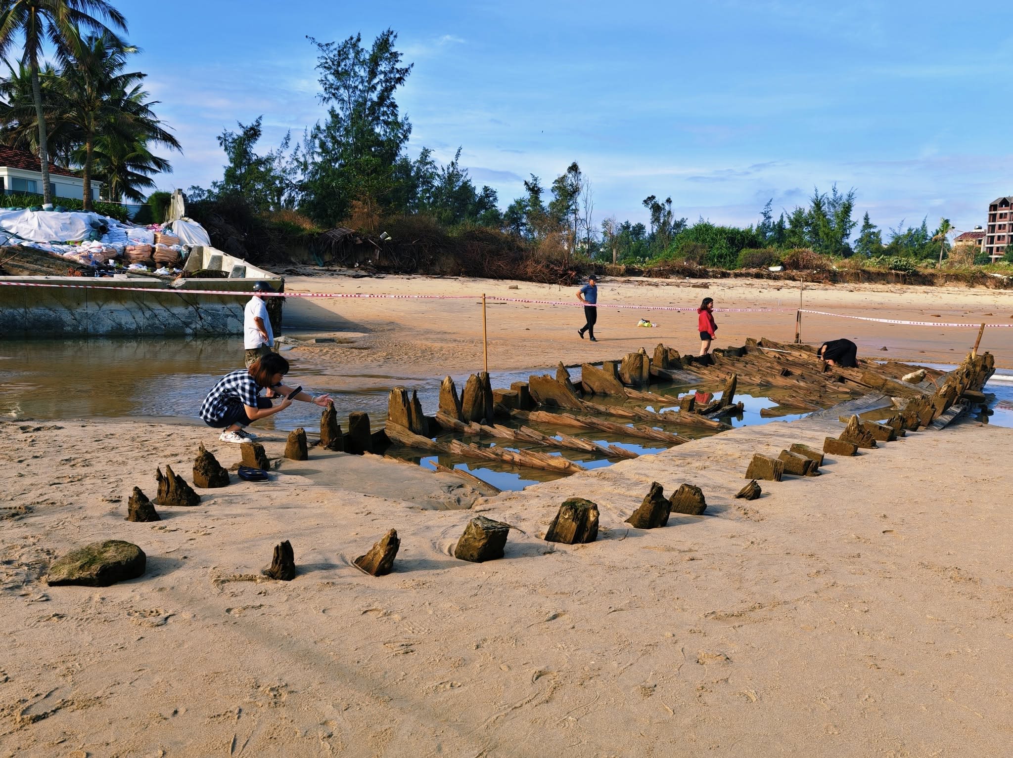 In recent days, the beach near the Thịnh Mỹ residential group (Hội An Tây Ward, Đà Nẵng City) has attracted crowds of residents and visitors keen to view the exposed remains.